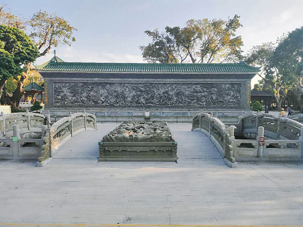 从广州宝墨园九龙桥走过去,就看到的就是“吐艳和鸣壁”了,这是宝墨园的镇园之宝,估计这是您见过的砖雕中最大的了。为什么呢?因为这块巨型艺术砖雕已经被列入了世界吉尼斯大全,被确认为“世界最大的砖雕作品”。