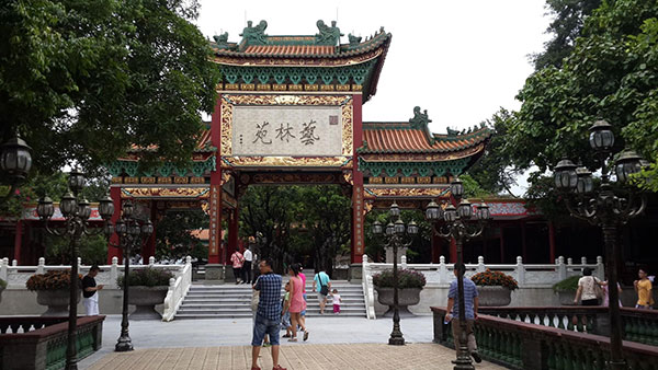 正门朱红漆柱悬挂的对联,正好概括了艺林苑辉煌贵气,文化内涵高雅的特点。牌坊背面,内壁和天花分别彩绘“百鸟朝阳”、“蟠桃大会”、“天女散花”、“ 封神榜”人物形象图像。这里地面铺砌的是明代白坭阶砖,已经是苑中文物之一。周围汉白玉花护栏,高贵典雅。