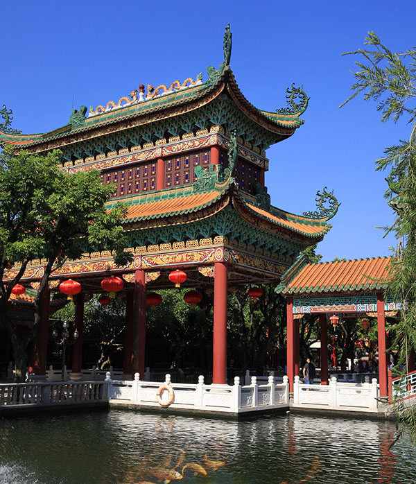 在宝墨园艺林苑牌坊旁边有一座和它很像的“古色新香”牌楼。高15.5米,宽14.36米,外观是两层,和艺林苑牌坊同样的朱红漆柱,玉包金、雕梁画栋,但是,牌楼比艺林苑牌坊还要高大宏伟,中间是以三色满洲玻璃装饰、楼内有绿色贴金云龙天花,富丽堂皇。